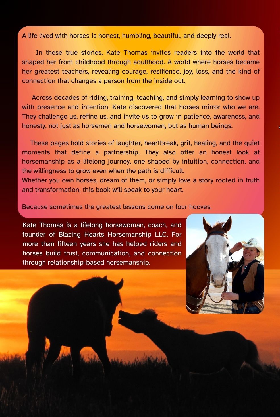 Dreams in Motion is a heartfelt memoir of the horses and people who shaped Kate Thomas's journey, from Colorado to Texas, through challenge, growth, and deep connection. Through real stories of heartbreak, healing, and resilience, it reveals the powerful lessons horses teach us when we truly learn to listen.